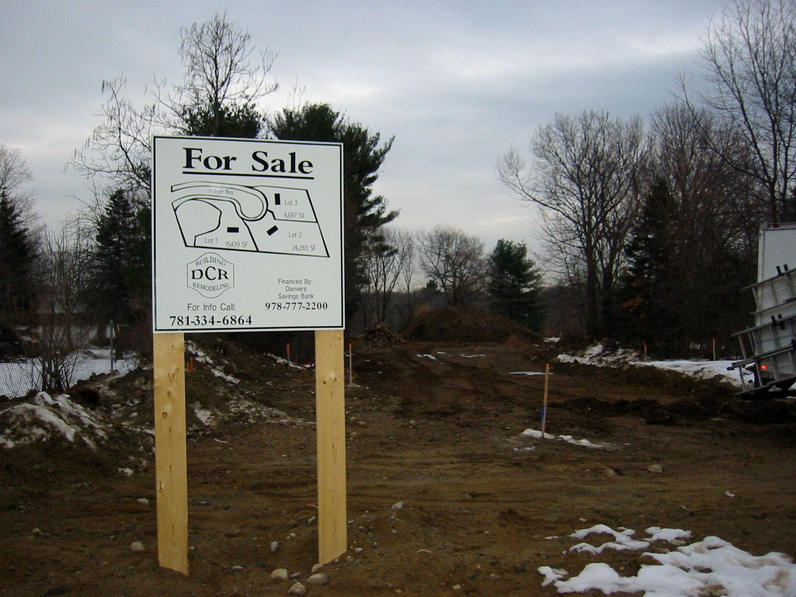 Concrete foundations with a gravel surface, fenced area, and a bridge in the background under a blue sky.